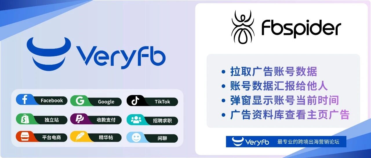 fbspider v2.2.4升级,新增拉取广告账号数据(简单/详细)、数据跨账号汇报、广告资料库一键查看主页所有广告,弹窗显示账号当前时间。Facebook广告管理效率工具。 Tags: fbspider Facebook广告管理 广告账号数据 广告资料...