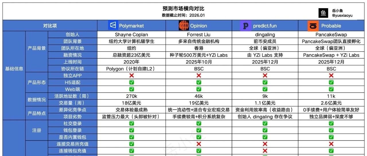 谁将脱颖而出?对比Opinion、PredictFun和Probable,分析其背景、数据与优劣。Opinion因上线早、流动性好领先,PredictFun创新资金效率但创始人存争议,Probable作为币安嫡系获支持但深度不足。预测市场借世界杯、美国大选或成风口,各平台功能各具...