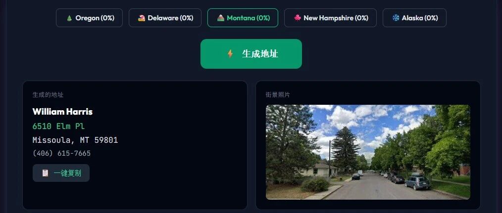 美国免税州地址生成器:真实街景+风控数据,免费跨境注册工具