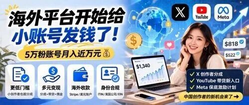 海外平台小创作者赚钱:X、YouTube、Meta降低分成门槛2026