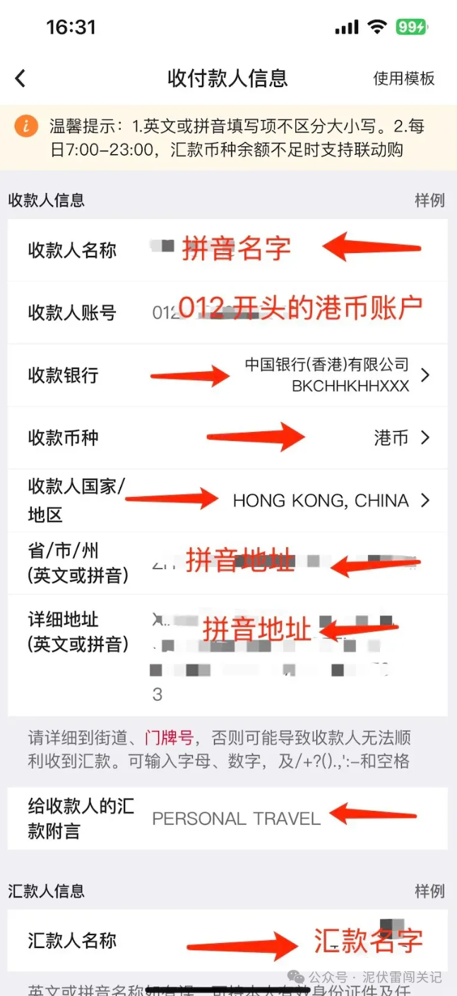 收款人姓名:确保填写的姓名与香港中银账户登记的英文名完全一致(拼音全大写,姓与名之间留空格,如"ZHANG SAN")。