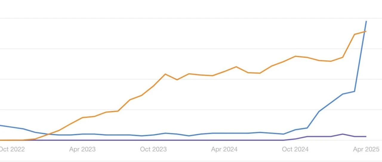 但是到了2022年12月开始,谷歌突然就给他流量了,之后黄色的流量曲线就一直在上升。