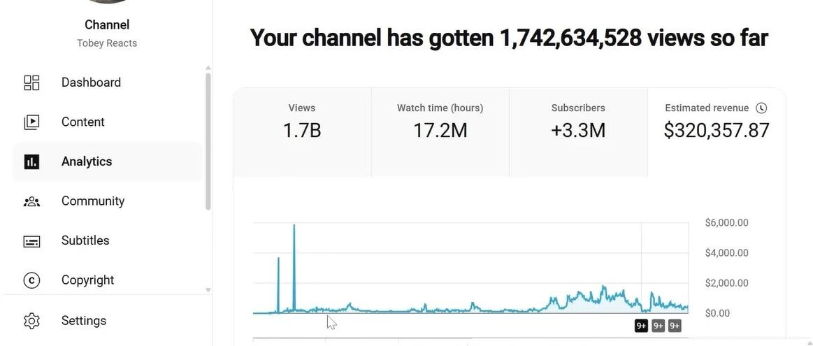 YouTube Shorts 可以说是2025年来钱最快的方法。看看下面一个油管频道主的真实后台数据,频道名称叫 Tobey Reacts,这个频道赚了32万美元。