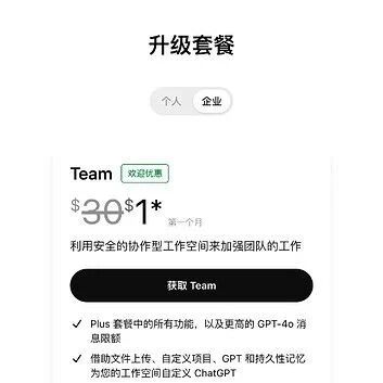而且 ChatGPT Team 计划,之前需要30美元/月,现在OpenAI开启了一个活动,可以首页1美元就可以开通。