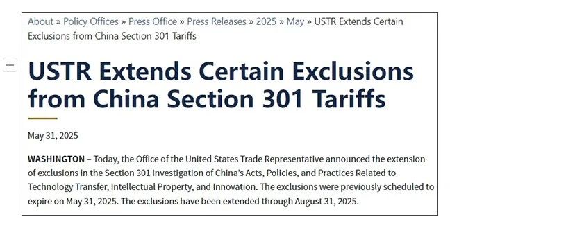 5月31日,美国贸易代表办公室发布公告:原本定于2025年5月31日结束的部分对华商品301关税豁免政策,将再