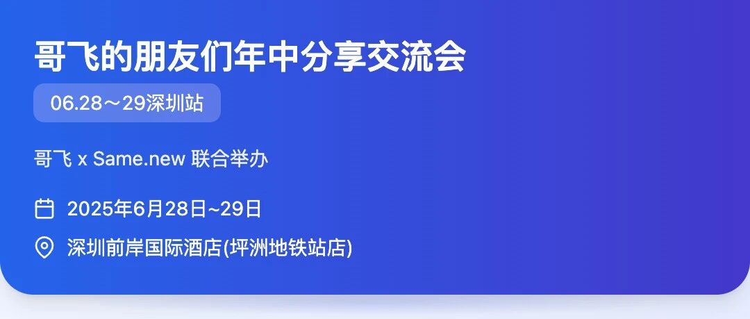 所以,哥飞来了,哥飞带着上站Hackathon活动来了。为了配合这次的上站Hackathon活动,哥飞找了Same.new赞助,所有参加Hackathon活动的朋友,都可以免费领取Same.new会员,用于快速开发网站。我们来看看两天的时间安排吧,时间有限,这次我们把签到时间提前到了12点到13点。接着是哥飞开场,欢迎大家,并且抽奖,顺便跟大家分享社群成立两周年的一些成绩。接着就是我们每次线下分享交流会的经典环节,八位嘉宾给大家带来他们的实战经验分享。不同的嘉宾有不同的身份,他们会各自从自己的角度,来分享自己的财富秘籍。这次,我请好朋友Gary来开场,他们我们聊聊谷歌广告投放那些事。万事开头难,对于一件从来没有做过的事情尤其如此,还没开始就想放弃。但是Gary能够让你从放弃到入门,并且做好投放。第二位分享嘉宾,SagaSu出海两年,出手很准,只做了四个产品,就有一个实现了月入2万刀,他是B端产品经理出身,我们来跟他学习一下,如何抓住用户的真实痛点做个产品满足用户需求并且获取到流量最终变现。第三位分享嘉宾更神秘,居然是一位高中数学老师,这两年,他用AI赚了不少钱,甚至还跟谷歌打过仲裁官司并且还赢了,到时候让我们一起来听听八宝老师的赚钱故事。第四位分享嘉宾,是Coco,她有着18年的外包B2B经验,她在群里一直不断跟我们分享通过SEO拿到询盘的喜报,这次哥飞邀请Coco来跟大家分享外贸B2B如何利用SEO获取能够带来询盘的精准流量。接下来是茶歇环节,哥飞请酒店为我们准备了精美点心和饮料,大家可以放松一下,休息一下。茶歇过后,第五位分享嘉宾,是哥飞的老朋友Span,他做了很多年的产品经理之后,从零开始学SEO,之后进入AI SaaS公司操盘英文SEO,大获成功。之后离职成为了一名SEO顾问,接了很多AI出海企业的SEO咨询服务。这次Span会跟我们分享,如何制定整体SEO内容规划,这个尤其适合拿到了投资的创业公司团队化做SEO。第六位分享嘉宾的介绍很简单,但是越简单越说明牛,他是哥飞社群每个月的新词新站比赛排行榜常客,经常获奖。也正是靠着不断上站,不断练习,现在他刚毕业就可以通过出海网站赚到比同龄人高很多的收入了。听听他赚钱路上踩过的坑和获取到的经验,说不定就对大家有帮助了。第七位分享嘉宾是Leo,他之前在某广告变现公司担任技术负责人,现在转型成为了一人出海公司,做了好多出海AI工具,哥飞知道他的一些产品,流量不小,收入肯定是不错的。大家可以听一听,一个老技术人是如何转型All In AI 出海并且做出成绩的。第八位分享嘉宾是本场活动的重磅赞助商Same.new的联合创始人John,这位04年的小伙子年龄不大,但是创业经历还是很丰富的,通过他的分享我们可以看到海外华人如何在美国创业并且拿到不错的成绩。最后一位分享人,是哥飞。这次,哥飞教你如何从零开始赚到第1美元,然后如何赚到第1000美元,再然后如何达到月入万刀。很多人报名时在犹豫,我一个站都没上过,能不能听懂,能不能参加,有没有现场教学?好,哥飞满足大家,用1个小时的时间跟大家再从头梳理一遍,到底出海做网站怎么从零开始,手把手的教你。其实哥飞早就想好了,要有这么一场分享,但是之前并没有公布,就是不想靠着这个吸引大家。但现在报名人数已经满了500人了,可以告诉大家了。接下来是晚宴和上站Hackathon活动启动,大家直接看图就好了。由于场地原因,我们没办法通宵上站,场地23点会关闭,大家到时候可以回房休息,或者其他安排,都行,大家都是成年人了,对自己负责就可以了。第二天,6月29日,早上8点,场地就会重新开放,大家可以早点起来,继续打代码。29号一整天的时间大概安排如下,到时候可能也会根据实际情况灵活调整。再次说一下,目前500个名额已满,无法继续报名了。如果你已经报名了,但还没进活动群,请加哥飞微信入群。最后再次感谢这次活动的重磅赞助商 Same.new 。