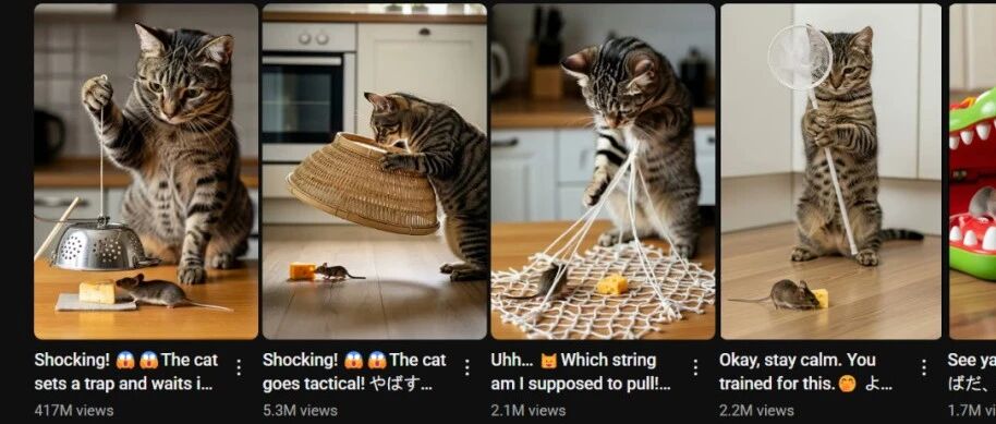 这种AI视频的爆火窗口期还在,但很快就会因为涌入海量的模仿者,内容迅速同质化。当满屏都是这种"猫抓老鼠"的时候,观众的新鲜感会迅速消耗殆尽,分到每个视频的平均流量自然会暴跌。