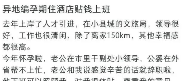 该网友在文中提到:"去年上岸人才引进,在小县城文旅局,领导很好,工作也很清闲。""老公在市里干副处小领导。""前期请了两个月假,回来工位被调到不太好的位置,领导说是体贴我,把大部分工作都分给合同制同事了,只留一部分保密性工作必须由我负责。""之后又在家里摆烂了一段时间没去上班",现在局里新招了两个公务员,她不得已才回来上班,还是"住酒店贴钱上班"。