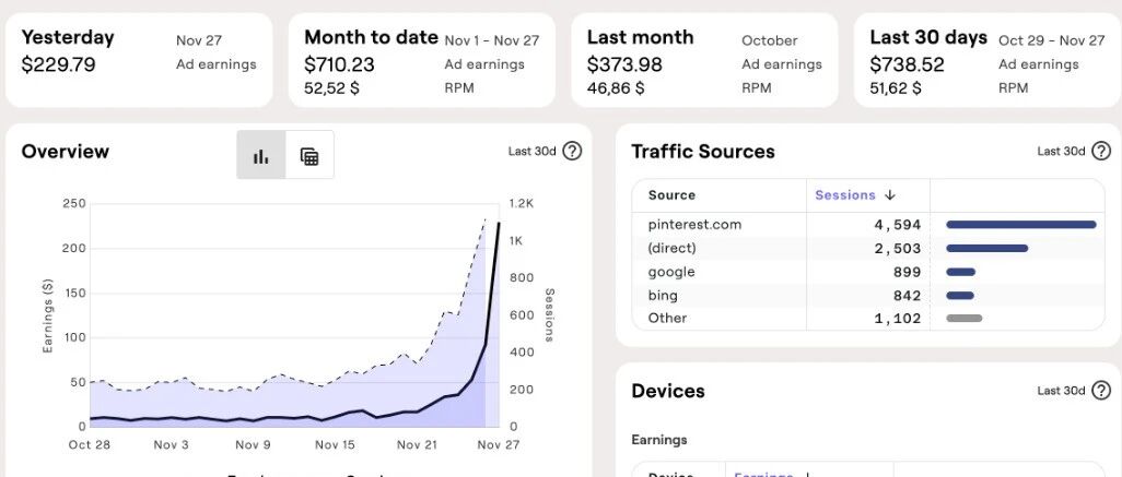赚钱是一个很好玩的事情,当你觉得一个月赚1万都很难的时候,有一天你赚到了,你就会很激动,激动我要用这个方法干下去,疯狂的干,因为这个时候你只对钱有欲望。只要你突破这个封锁,其实一年赚个一百万也不是不可能,大不了你付出的时间和努力是乘倍的,但是人赚钱也是有机遇的,谈不上是运气,很多人的运气是站在一开始你都时刻准备着,不然运气来了你也抓不住。而且我之前推的项目,基本都是可以赚钱的,直到目前为止还是可以做,只是没有那么容易做而已,但是在我认为跟当初也是一个样子,还是大有搞头,我觉得比你去打工机会还是多点,但是我从来没有要求那个人直接辞职来干,都是建议兼职来做。今天我随便分享1个网站,都是创造了很多收益的,互联网虽然现在有了AI,确实会有影响,但是在AI那么来势凶猛的技术,都没有把网站搞垮,所以我只能说网站还是可以持续发力的。就这个网站,一年收入大概8千美金,每个月大概有7百多美元,话说回来,互联网上赚钱,那个不是把这样类似的事情批量去做了,所以只需要批量建站就行了,想具体看可以自己输入图片上的地址查看。大家可以看看这个地方,也是这个网站主要流量来源,他主要是通过instagram、youtube、facebook、pinterest来进行推广和分享,可以点击这些按钮进行跳转查看,当然google的自然搜索流量也不少。关于网站的收益就聊到这里,其实做网站基本现在互联网人,人人都会做一个网站出来,但是光有个网站,没有内容,不做推广也是无人问津的,就算你报名去学习做网站,你也不一定能做一个可以赚钱的网站出来。我只是告诉大家,现在做网站还是可以操作,也可以赚钱,但是一定不是赚块钱的路子,其实现在想想,基本赚钱都不容易,没有容易二字,如果大家要做一定要学习+坚持。好了,今天就说到这里吧,如果大家要学习国外LEAD赚美金,可以找我,虽然不一定带你赚大钱,只要自己肯学习,操作起来,入门赚美金我觉得问题不大。附:诚信为人,认真做事,人在做,天在看。每日更新一篇关于技术或者国外lead文章长期坚持原创不易,如文章引起大家共鸣请大家关注,点赞,转发,以支持勤于奋继续分析创作。