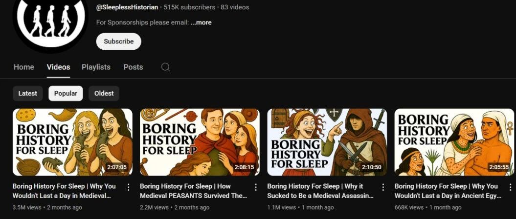 这次为大家拆解一个很聪明很暴利的油管频道 - Sleepless Historian。这个频道开播 60 天,就做到了 50 万订阅。这个频道是不露脸的faceless频道,而且是AI做的,用 Chrome 插件看数据的话,会发现这个频道过去 28 天仅广告收入就有 6.3 万美金,太疯狂了!