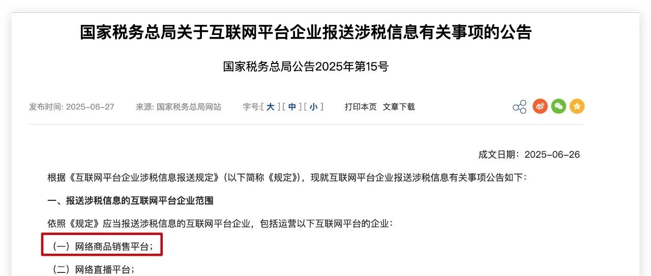 2025年6月底,国家税务总局正式发布《互联网平台企业涉税信息报送规定》实施细则,对包括亚马逊、TikTok