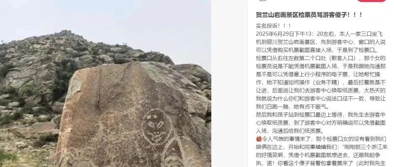 网友发帖称前往贺兰山岩画景区游玩时遭检票工作人员骂"傻子"。