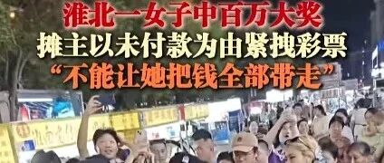 据此前报道,7月6日晚,安徽淮北市某步行街发生一起彩票纠纷事件。一名女子在未付款情况下刮中百万大奖,摊主以未付款为由夺走中奖彩票,引发路人围观报警。
