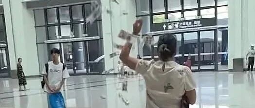 7月4日上午,广州白云高铁站西广场与地铁连接处,一名女子边走边抛撒现金。