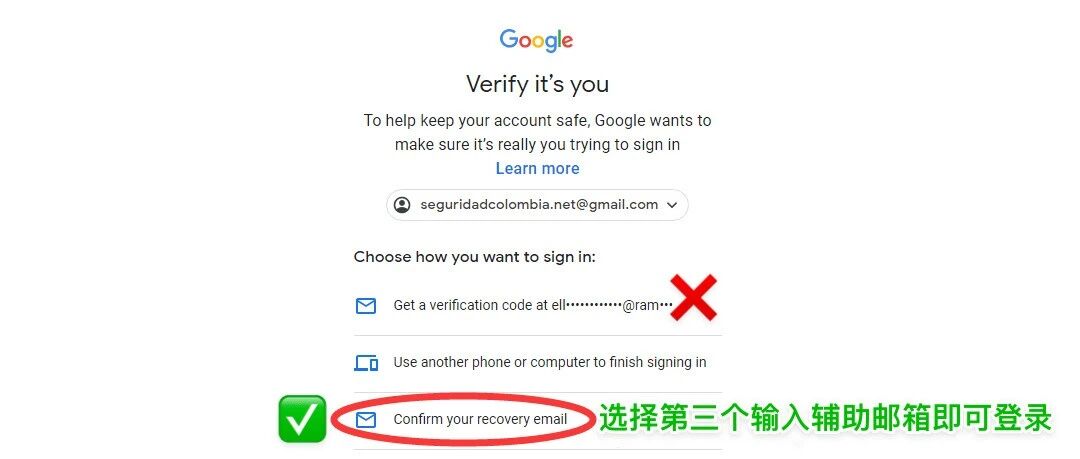 访问 Google Voice 官网,点击右上角 Sign in,输入账号和密码。 如果提示验证,选择【确认您的辅助邮箱】(上图)。