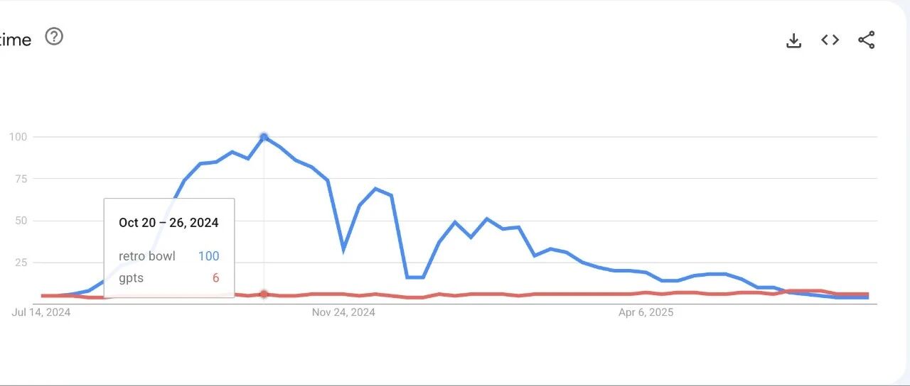 关注美区游戏产品的朋友们多少应该都看到过这个产品。这个游戏2020年上架应用市场,目前app store已经有91万评分了,目前的评分高达4.8分。他们的产品在iOS app store最近30天累计有20万下载,商城收入达到了10万美金。我以为像这个复杂程度的游戏,是没有H5版本的,因此也一直没关注。直到最近在google trends里面看到了 retro bowl 这个关键词。过去一年的trends如上图,最高峰的时候到了gpts的16倍。原来这种复杂程度的游戏,也能找到H5版本,并且做得还可以。顺着 retro bowl这个关键词,看到了两个网站还不错:io站目前已经拿到了这个词的第一名,月访问量是60K。