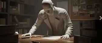 Create 5 detailed 3D render prompts for a detective cold case documentary. Each prompt shouldfollow this format: 'A highly stylized 3D render of a featureless human figure with no facial features,fully smooth and reflective material, in a [scene description with specific props and environment], thefigure is positioned [specific pose/action], wearing [clothing details]. The scene is lit with [lightingdescription] casting [shadow details], and the background is [background description]. The figure'ssurface is perfectly seamless and ultra-polished, no lines, no seams, no joints, no cracks, no artifacts.Cinematic angle [camera angle]. Ultra-realistic 3D rendering.' Make each scene relate to detective workand investigation.