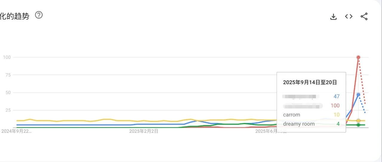 趋势如上图,红色线是今天的关键词,蓝色的线是昨天的关键词。