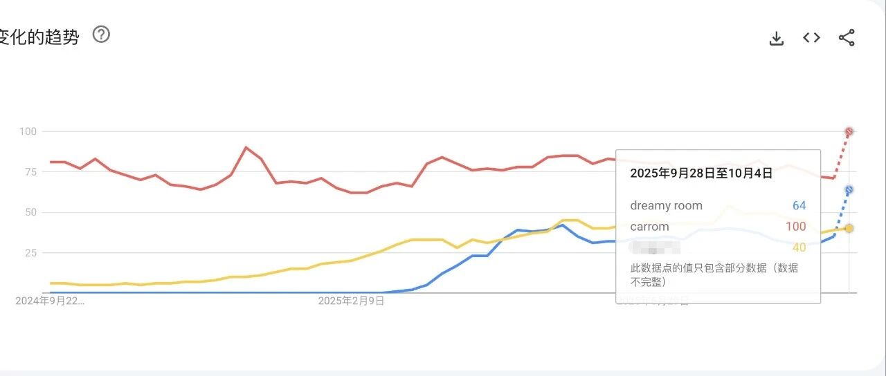 搜索量不算很大,大概是dreamy room 的60%,从去年9月开始,逐步上涨,还算比较稳定。