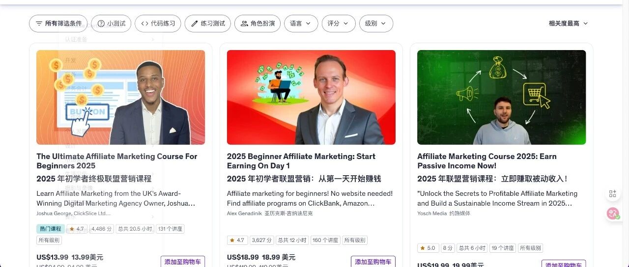 所以在udemy上学习成本还是很低的,相比我们国内一个教程几千上万的培训费,自己学习之后还不一定能赚到钱,所以风险还是要低很多。