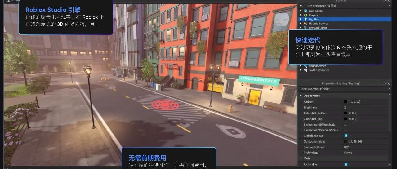 它的开发其实没那么复杂,只需要安装一个叫Roblox Studio的编辑器,在里面就可以进行开发/创作。