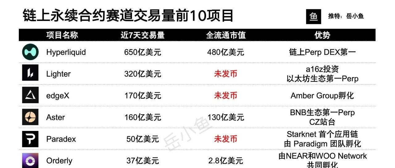 总的来看,前十平台基本都有豪华的团队背景,更重要的是占据了重要的生态位,得到了有力的扶持,比如BNB生态的Aster、以太坊生态的Lighter、Solana生态的Drift等等。