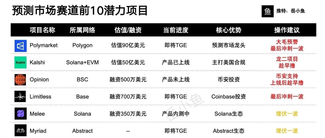 ··················Start··················最近预测市场赛道爆火,这绝对是下一个极具财富效应的新赛道。预测市场是以太坊创始人Vitalik一直在说的"低风险DeFi",币安也正在鼓励和推动预测市场应用。预测市场的价值在于用资金投票,实现信息聚合和信息发现。总的来说,预测市场有正向外部价值,而赌博则是纯粹基于运气的内耗。这里不再过多阐述预测市场的价值,我们还是重点看下预测市场目前有哪些潜力项目?我们到底该参与哪些项目?我整体梳理了市面上信息以及自己亲手体验之后,汇总了10大潜力项目:Polymarket很早就出现了,创立于2018年,但一直不温不火。在2024年成功预测了美国大选结果后,大家才真正关注到这个项目以及这个赛道。Polymarket即将发币,目前还有一个短暂窗口期,建议最后冲刺一波,在TGE之前再刷一下交易量。Kalshi是预测市场赛道估值第二高的项目,达到50亿美元。Kalshi主打的是美国合规,比Polymarket更加合规,受联邦政府监管,已经有了牌照。项目还没有上线,已经吸引了社区的注意力,热度极高。核心是因为币安创始人CZ和何一目前非常重视预测市场赛道。而这个项目是币安投资的,在BSC链上占据了重要的生态位。大家预期Opinion会像链上合约平台Aster一样,受到币安大力支持之后,创造新一波的财富效应。这个项目9月份时在Kaito预售,认购金额超 2 亿美元,超募 200 倍。核心是因为这个项目是Coinbase投资的,在Base链上占据了重要的生态位。这个项目在以太坊Layer2网络Abstract上占据了重要生态位。The Clearing Compony融资了1500万美元,是前Polymarket团队出来开发的。这个项目主打合规、无许可,补足Polymarket的短板。目前预测市场上都是西方文化主导的预测内容,希望在这个项目中可以出现东方的本地化预测内容。这个项目目前还在测试网阶段,每日可以领取测试币进行参与。我最近在摸索最优的交易路径,后续和大家分享一下相关操作技巧。··················END··················