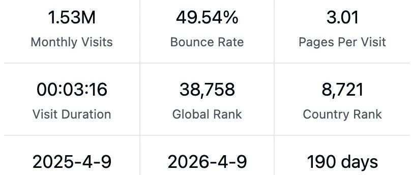 现在我们可以来看看这两个网站的流量数据了。 先看 chessigma.com ,域名注册于 2025 年 3 月 23 日,实际上线时间是 3 月 27 日。目前月访问量 122 万。