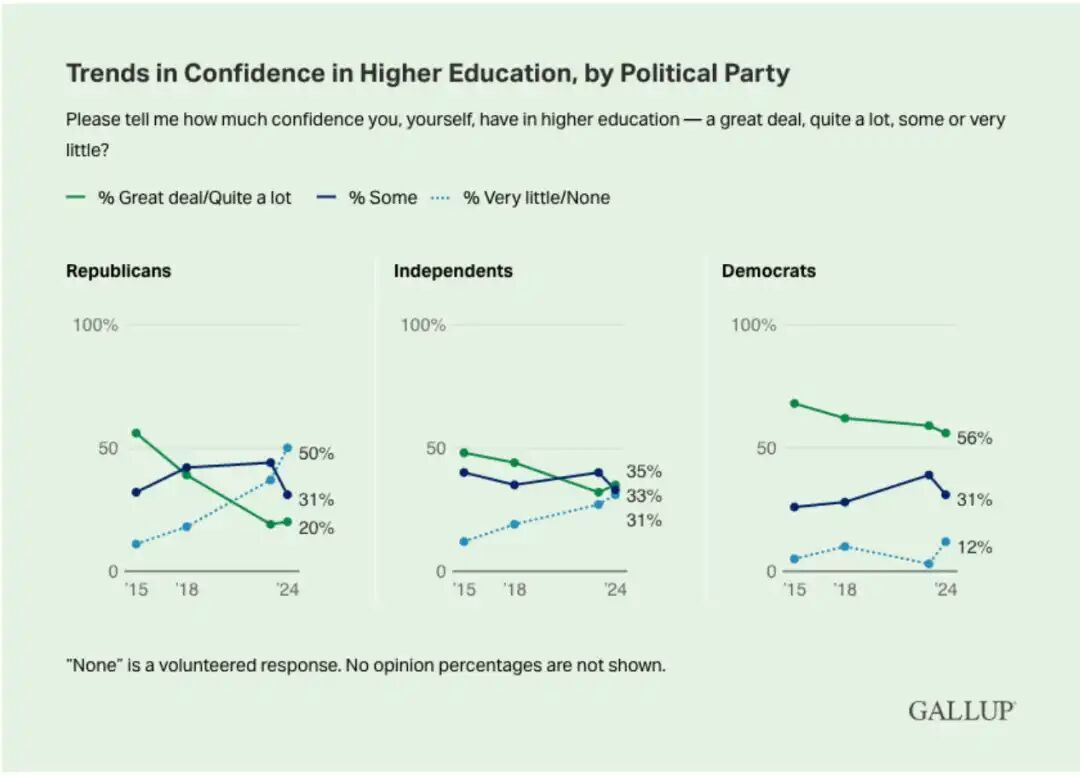 抛开特殊利益集团和特朗普的狭隘,我感觉还有更深刻的内在因素在发生。美国一个强大的派系对科学以及普遍意义上的专业知识抱有深深的敌意。证据就是,看看过去十年共和党对高等教育支持率的急剧下降: