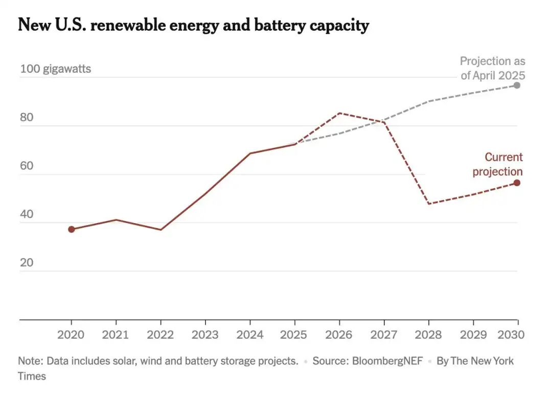 尽管特朗普宣称"钻吧,宝贝,钻吧",但由于政府的敌意,美国太阳能和风能的预期增长受到了阻碍,甚至可能停滞不前:
