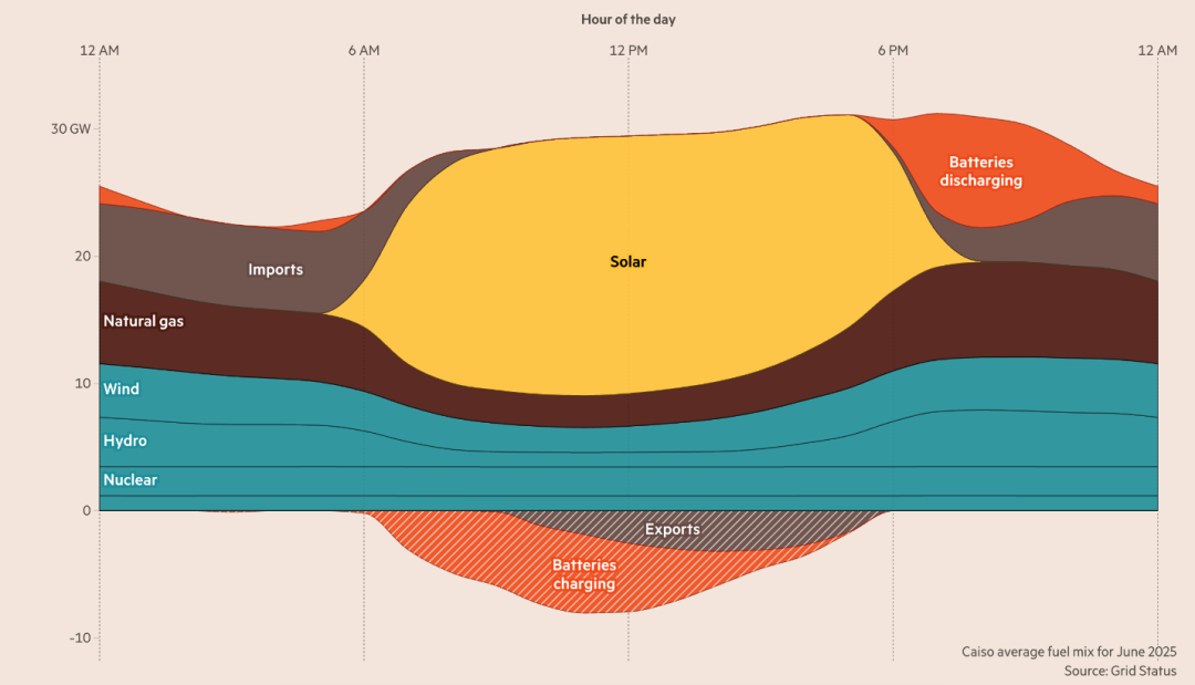 特朗普的能源部长克里斯·赖特表示,太阳能发电不可靠:"太阳落山和落日时,你也必须有电,而太阳几乎每晚都会落山。" 因此,这位全球科技最先进国家的能源部长并没有意识到,电池技术的飞速进步正在推动一场能源革命。而这场革命正在美国发生,比如加州。以下是加州六月份平均一天的电力供应情况: