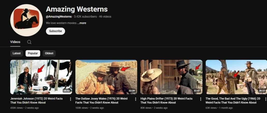 这个频道发了45个视频,最老的视频1个月,马上就有8800播放量。这个领域很细分,是关于西部电影的,目前有110万播放量。