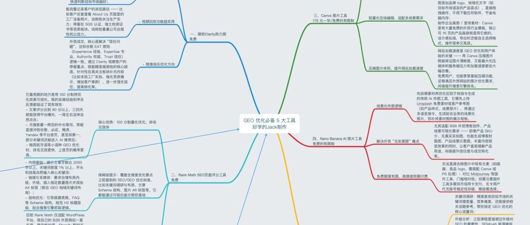 之前给大家分享过一篇 GEO 优化终极指南,还整理了超详细的思维导图,没想到收到了一两百位朋友的热情留言和私信,都在问我要导图,我也一一给大家安排上啦!能感受到大家对 GEO 优化的关注,也发现大家特别喜欢思维导图这种形式 —— 毕竟它能把复杂的知识点清晰梳理,让大家一眼 get 核心逻辑~