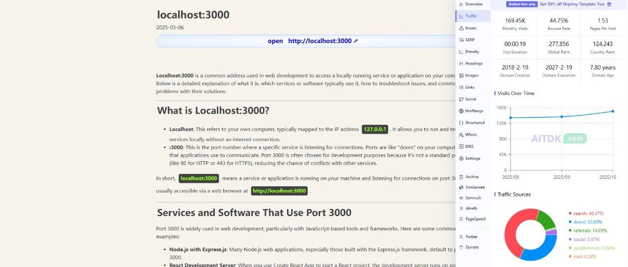 让我惊呆了,这样简单的一个网站,竟然有接近17万月访客。网站仅仅是介绍了一些"localhost:3000"这些本地测试地址的内容,还做了其它常用的本地链接地址对应的页面: