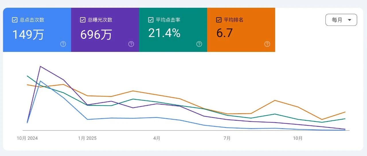 那么这里就有一个需求值得去做了,可以搞一个浏览器插件,识别到用户打开了 GSC 网站后,自动打开一个新页面,切换到按月查看数据,自动下载数据到本地保存,然后插件还能提供一个页面来查看本地数据,这样就不用担心只能看十六个月数据了。