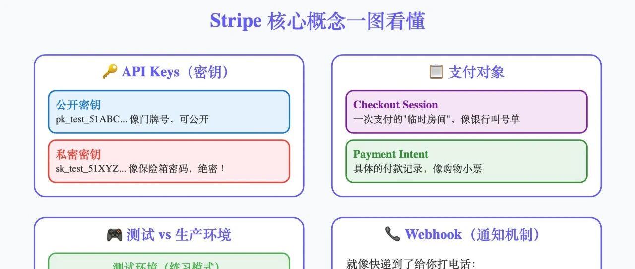 不需要自己做支付页面,Stripe 提供了现成的支付页(Checkout),安全又好看,支持多种支付方式。