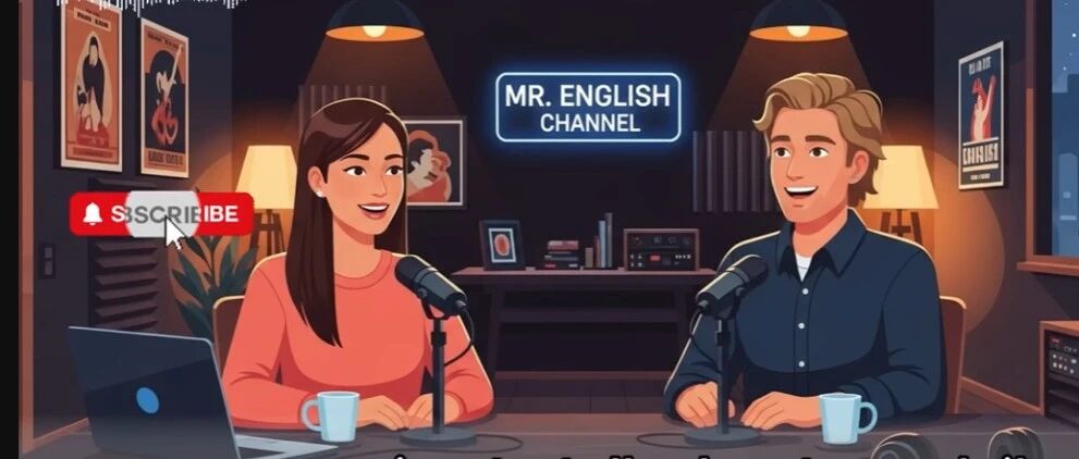 Create a cozy podcast studio scene in a flat,modern cartoon illustration style.Scene:Two friendly podcast hosts sitting across from each other at a wooden table.A woman on the left and a man on the right, both smiling and talking naturally.Each person has a professional microphone on a stand in front of them.A laptop and coffee mug on the table. Warm studio lighting with hanging lamps above.Background:Dark, cozy studio room with soft shadows.Bookshelf, framed posters, plants, and audio equipment behind them.A glowing neon sign on the back wall that reads:"YOUR CHANNEL NAME HERE"Style:Clean flat vector illustrationSmooth lines, soft gradientsWarm color palette (dark blue, brown, orange, soft pink)No realism, no photo texture, no 3DYouTube educational podcast aestheticMood:Friendly, calm, welcomingFeels like an English learning podcastProfessional but relaxedComposition:Centered charactersBalanced lightingClear focus on the hostsHigh quality, YouTube thumbnail ready
