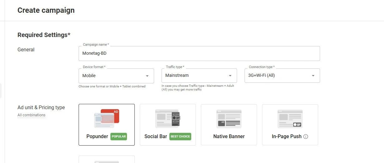 我们选择Create Campaign,我想试试昨天提到的Monetag,我选择mobile类的mainstream流量,popunder是他们家使用比较多的ads类型,我选择这个。