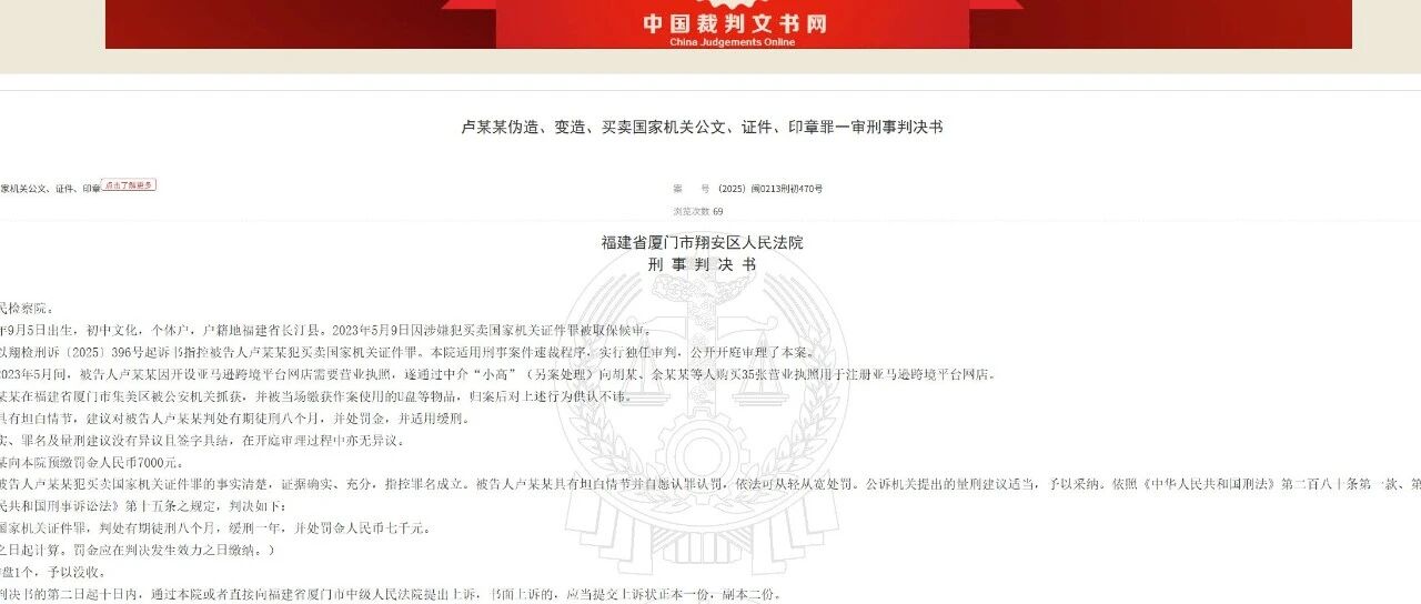 起诉指控,2023年年初至2023年5月间,被告人卢某某因开设亚马逊跨境平台网店需要营业执照,遂通过中介"小高"(另案处理)向胡某、余某某等人购买35张营业执照用于注册亚马逊跨境平台网店。