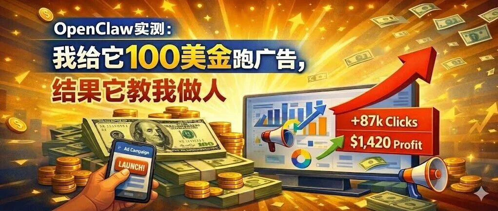 实测AI广告投放工具OpenClaw。作者给予100美金预算和基础配置,让AI自主决策投放策略。测试中,AI自行修复API问题,跳过冷启动直接买量,并基于实时数据做出反直觉的优化决策,如保留高花费Zone最终获得转化。结果显示广告开始盈利,预计ROI超20%。作者认为AI已从工具进化为可自主管理的"投手",并计划扩展其应用至素材抓取和批量制作。