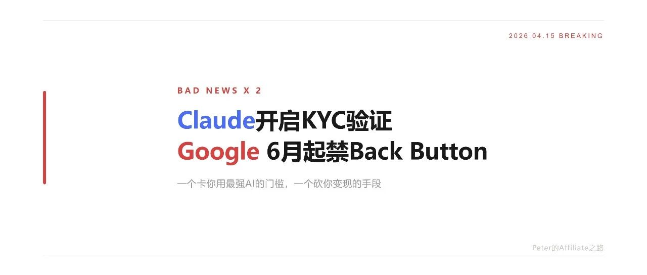 Anthropic开始对Claude用户推行身份验证(KYC),需上传身份证件和实时自拍;同时Google宣布6月15日起将Back Button Hijacking(返回按钮劫持)列为垃圾邮件,等同恶意软件。AI用户应立即导出对话记录备份,网站站长需排查广告SDK避免违规。适合使用AI工具和依赖广告变现的从业者。